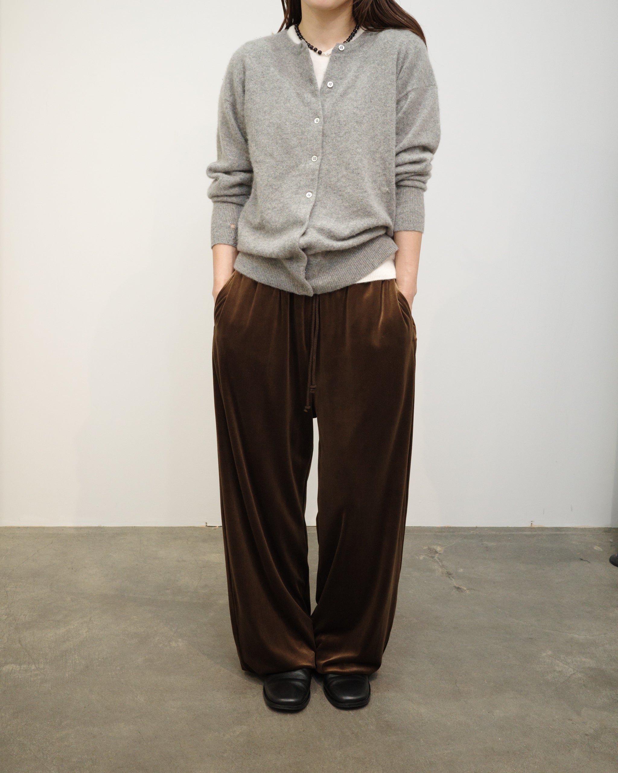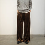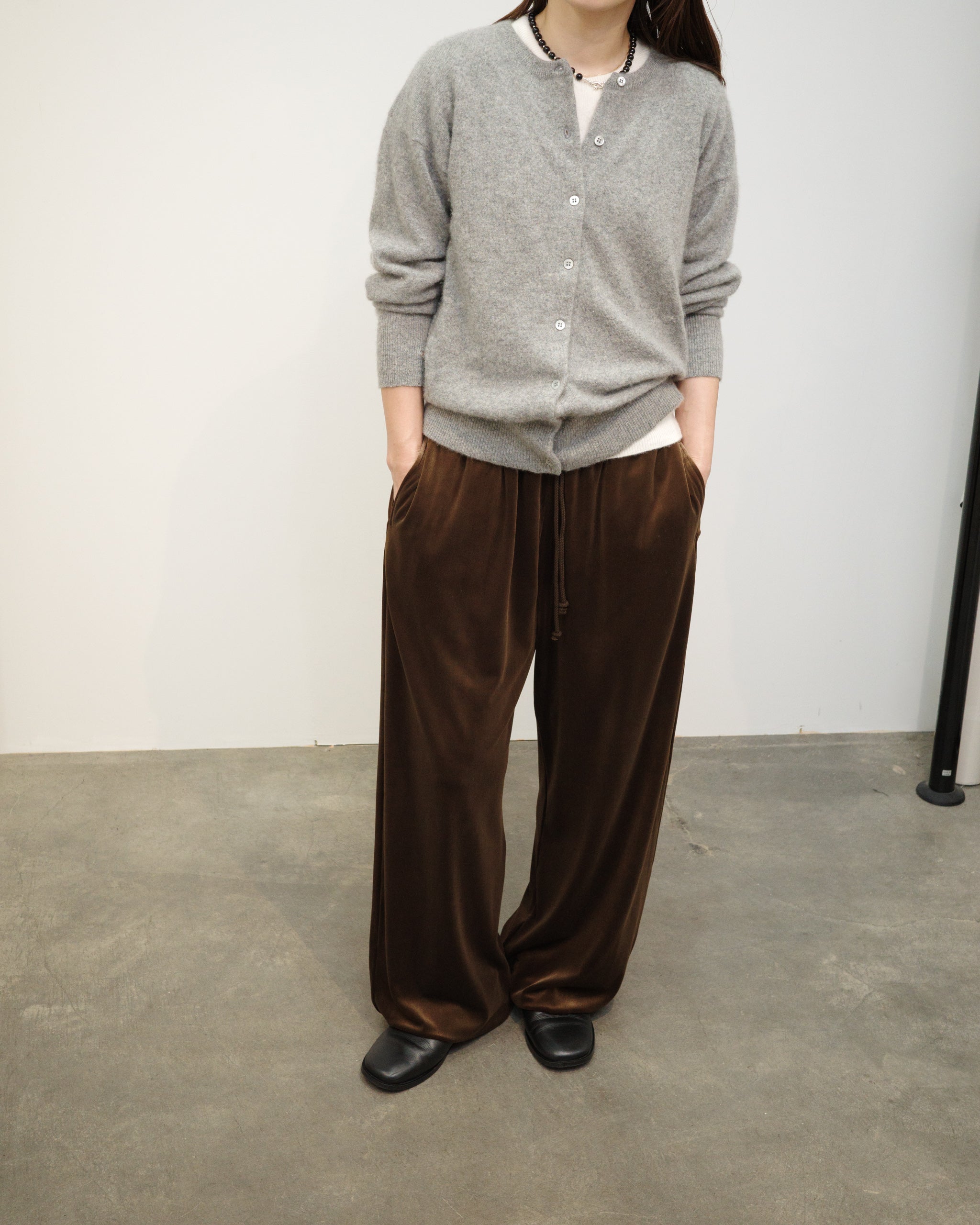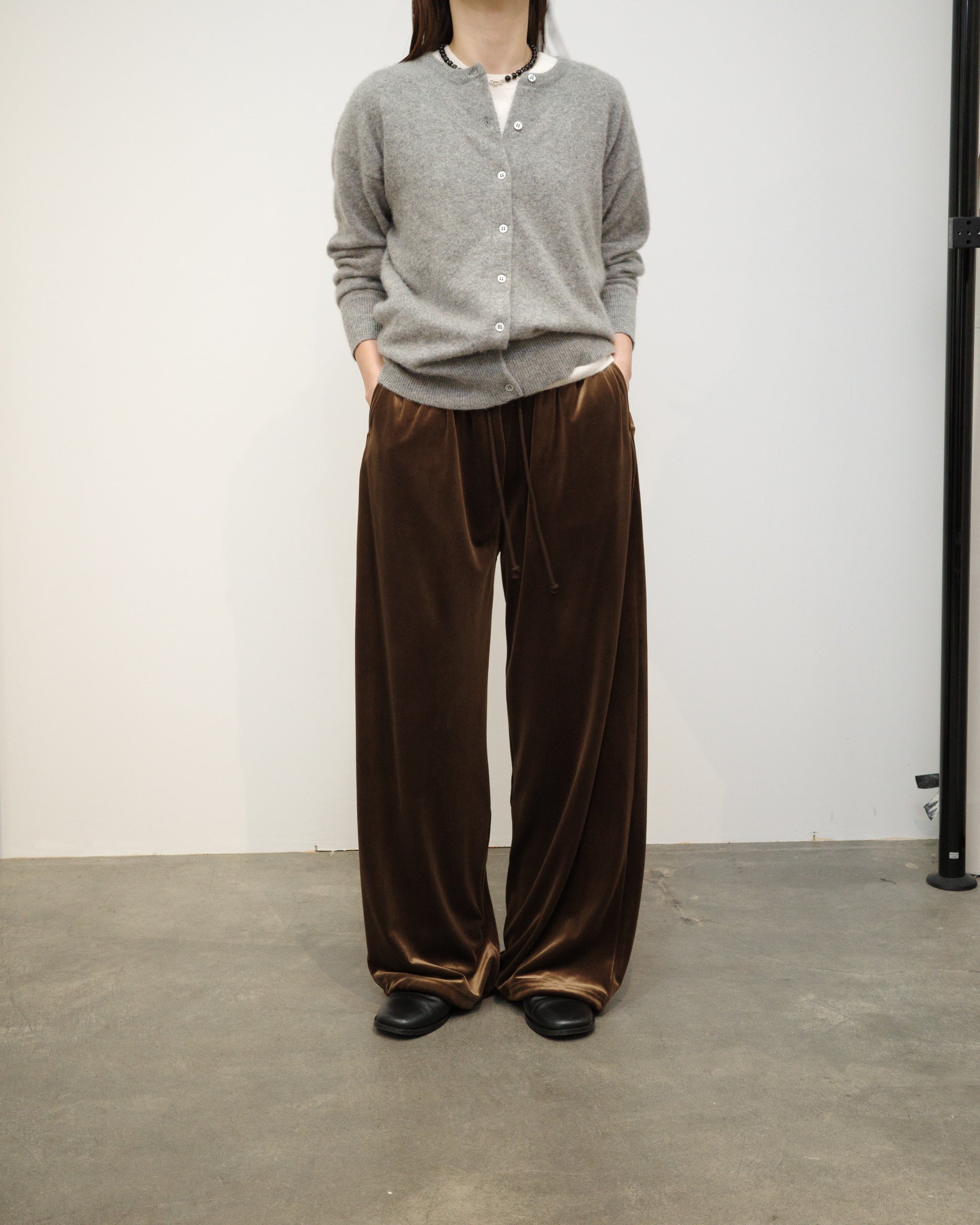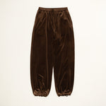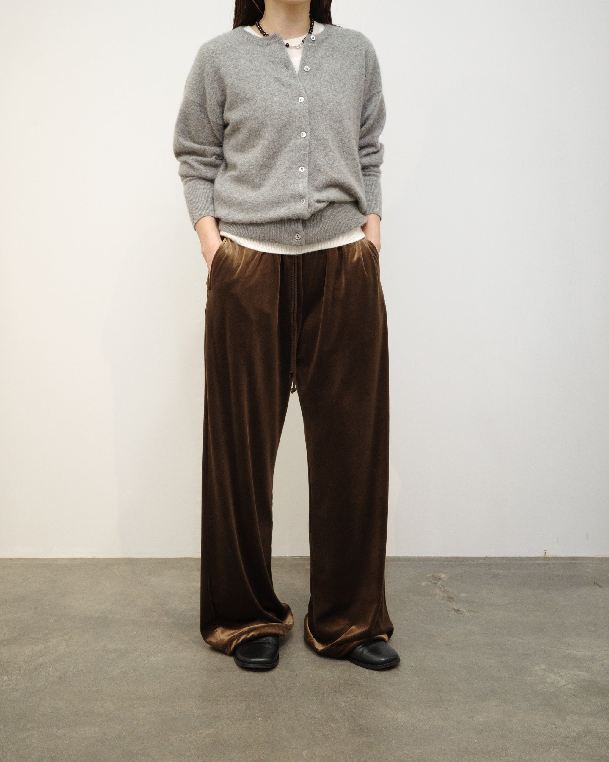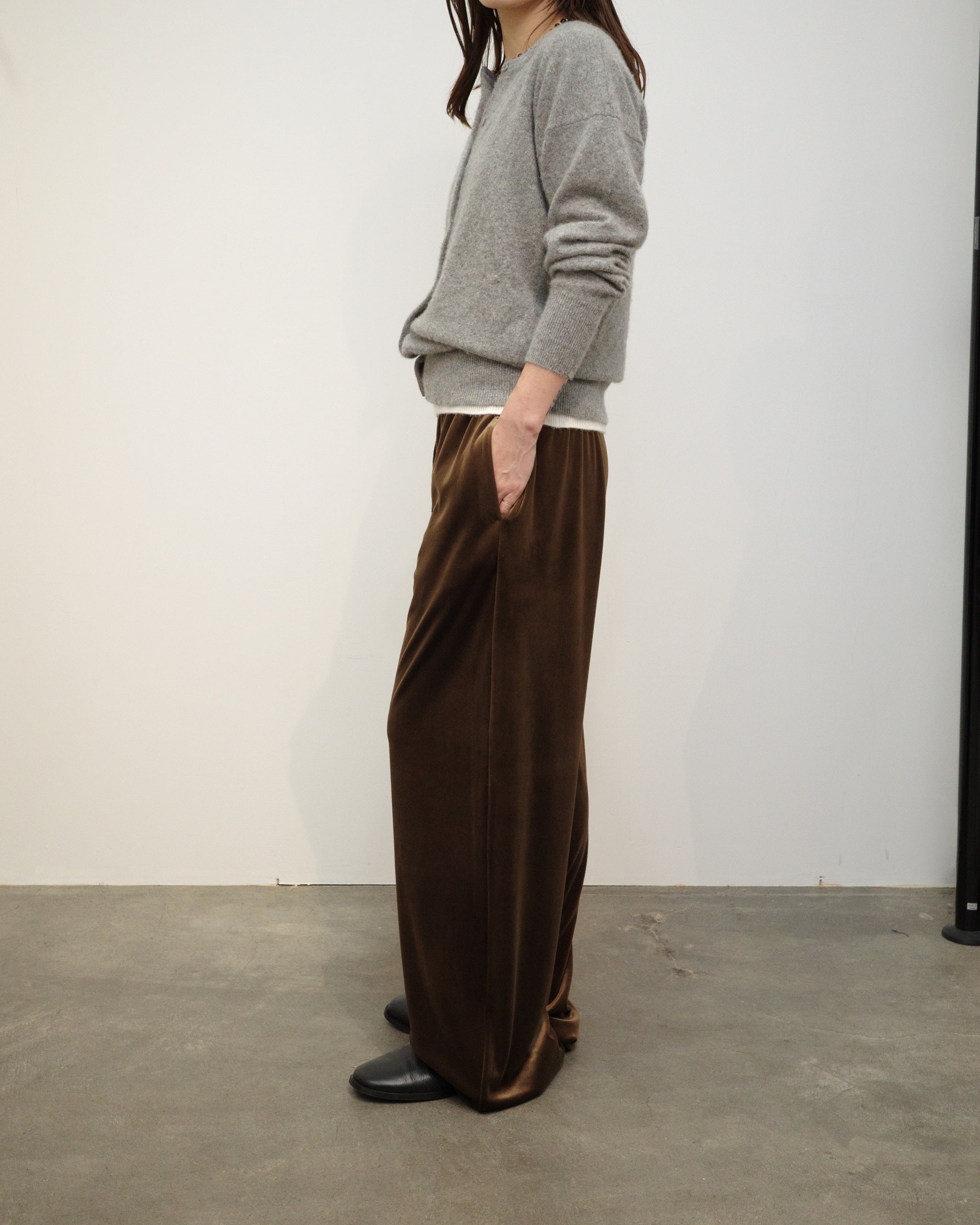 ウエストゴム、ドローコード入りのイージー仕様のベロアパンツ。