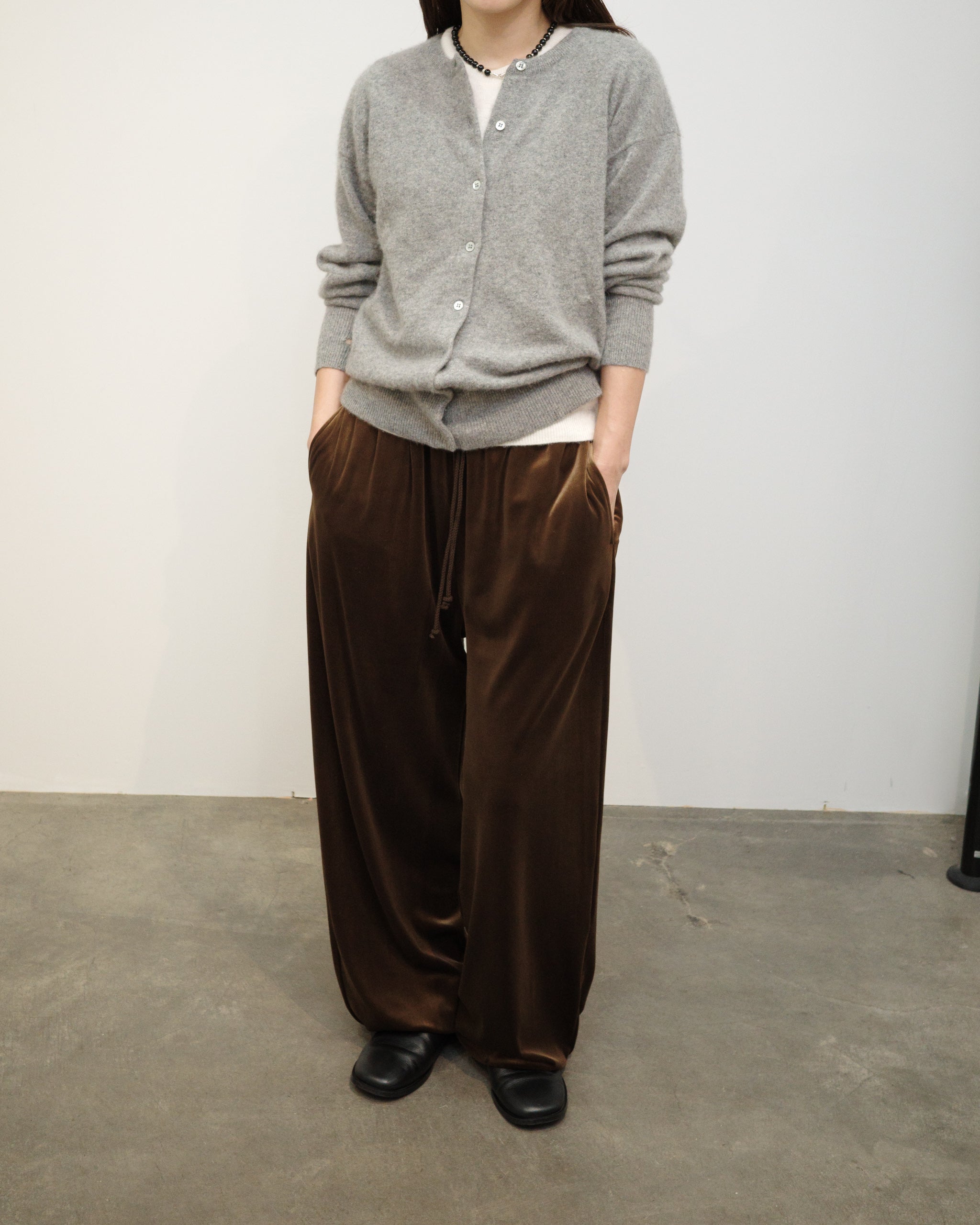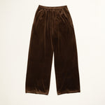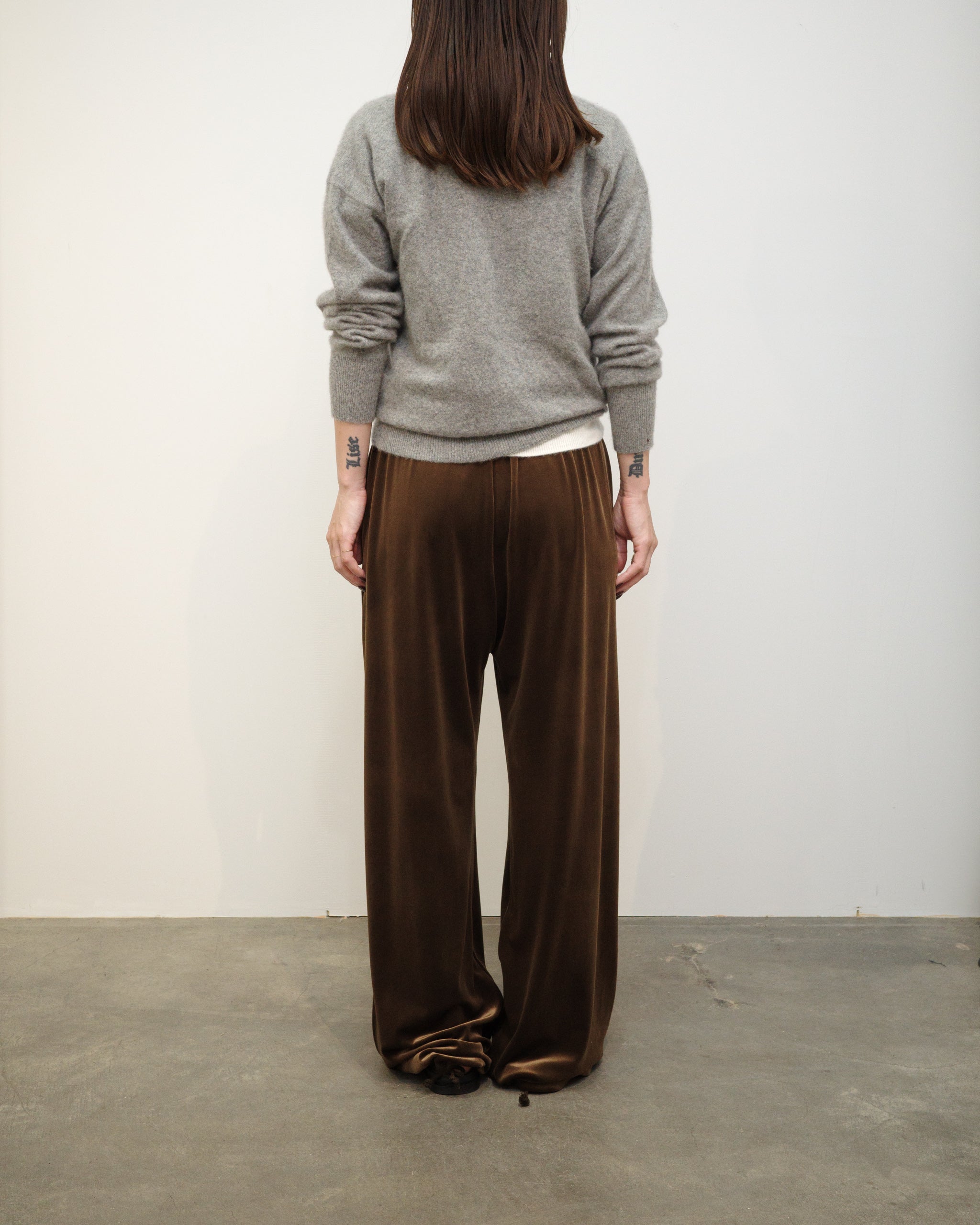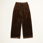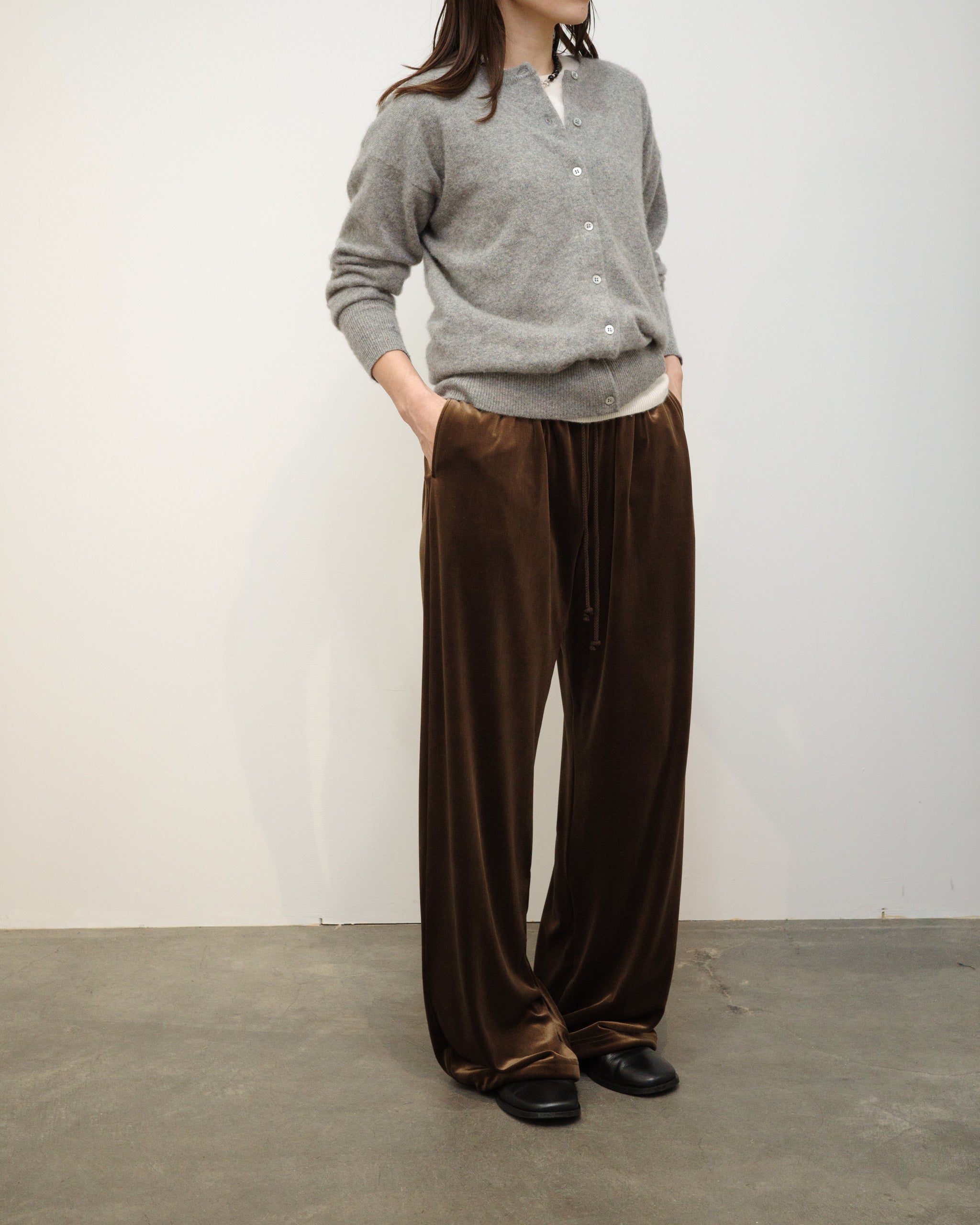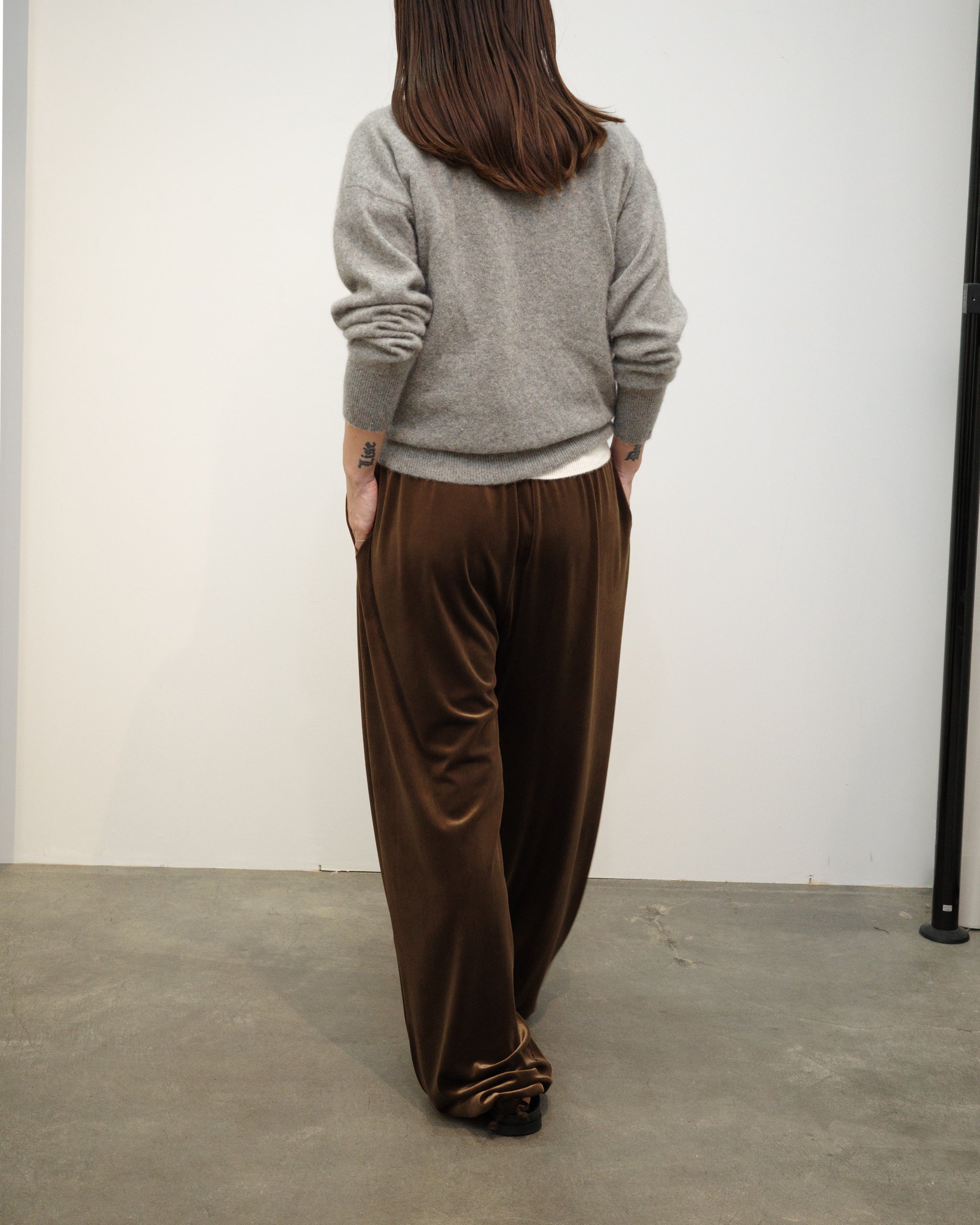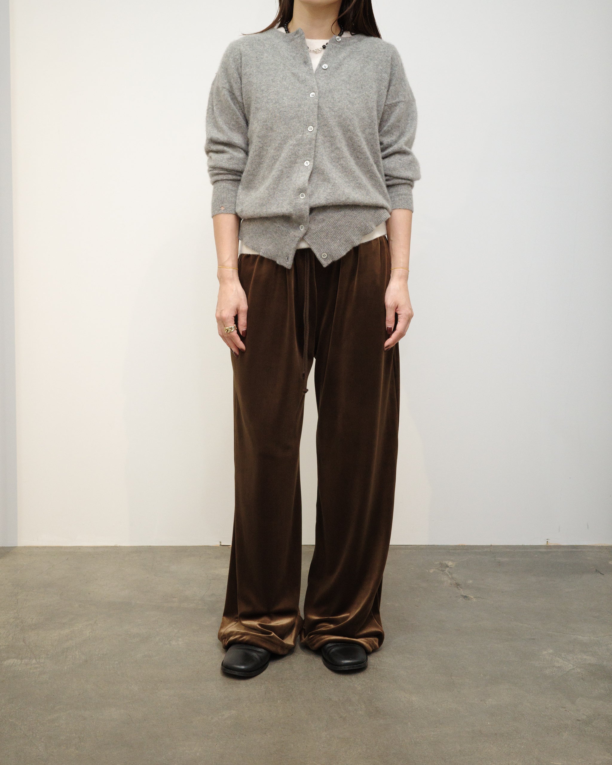 ウエストゴム、ドローコード入りのイージー仕様のベロアパンツ。