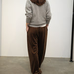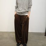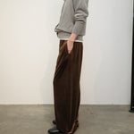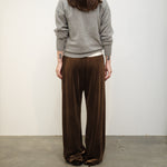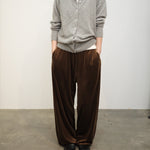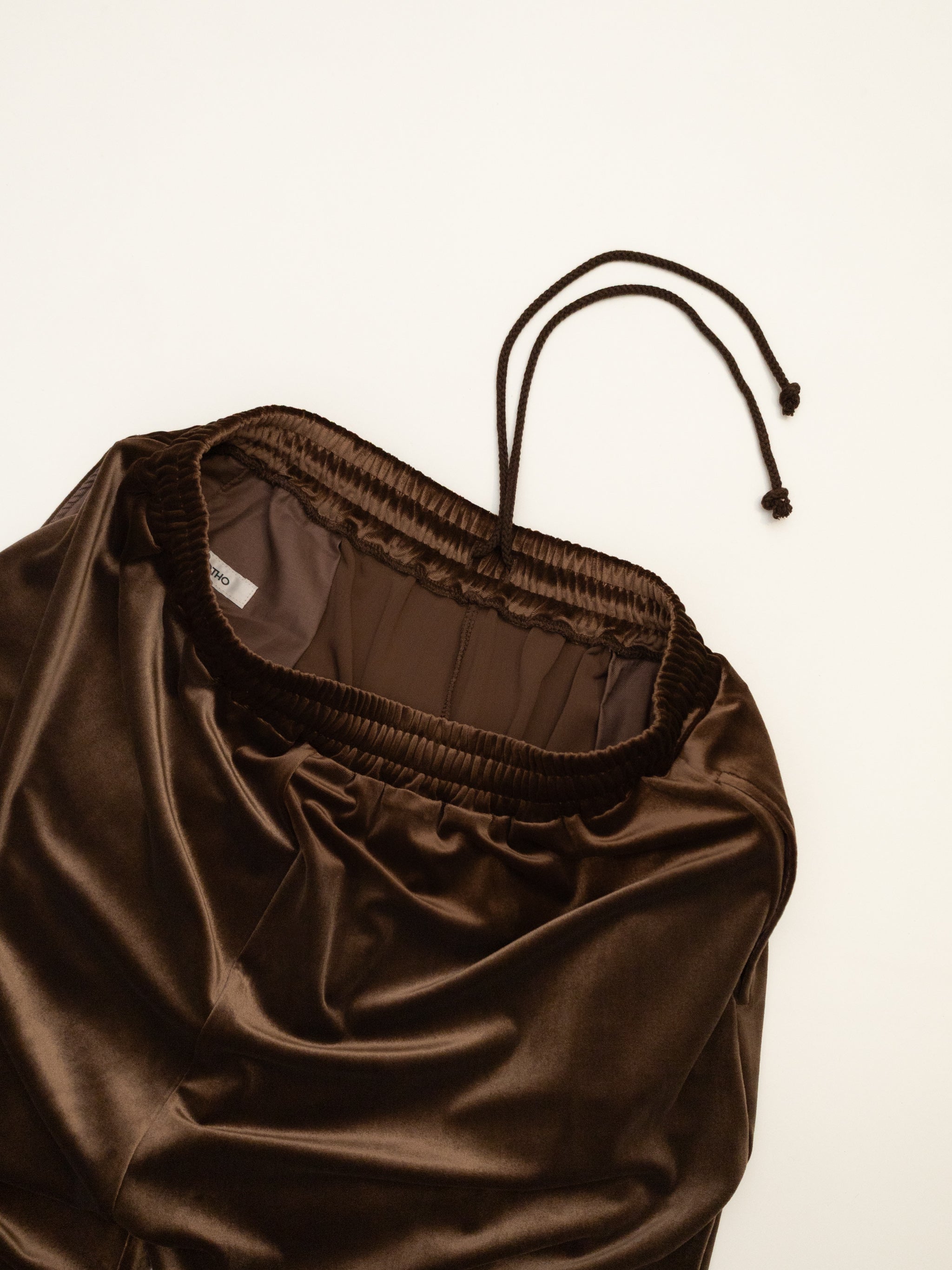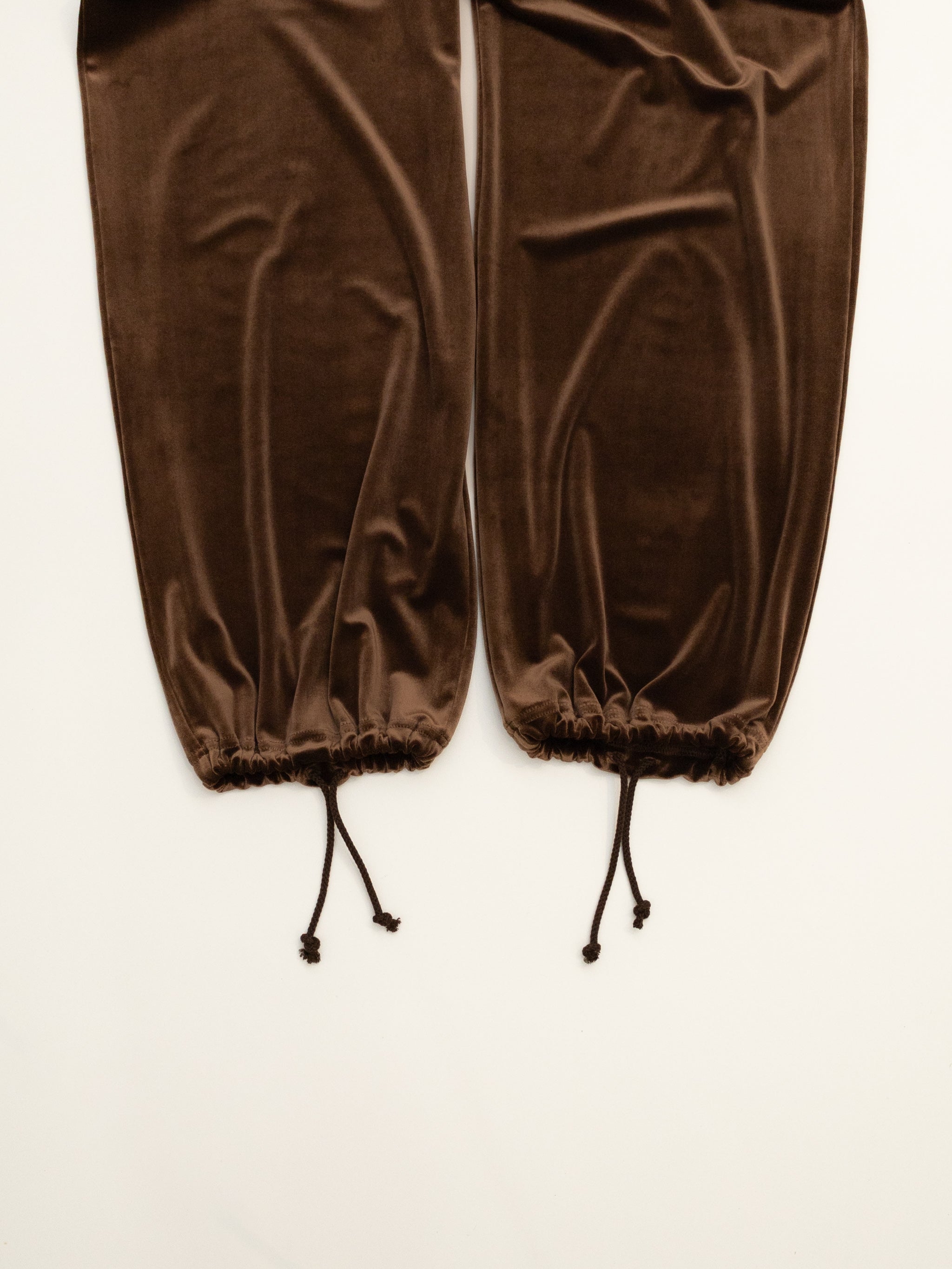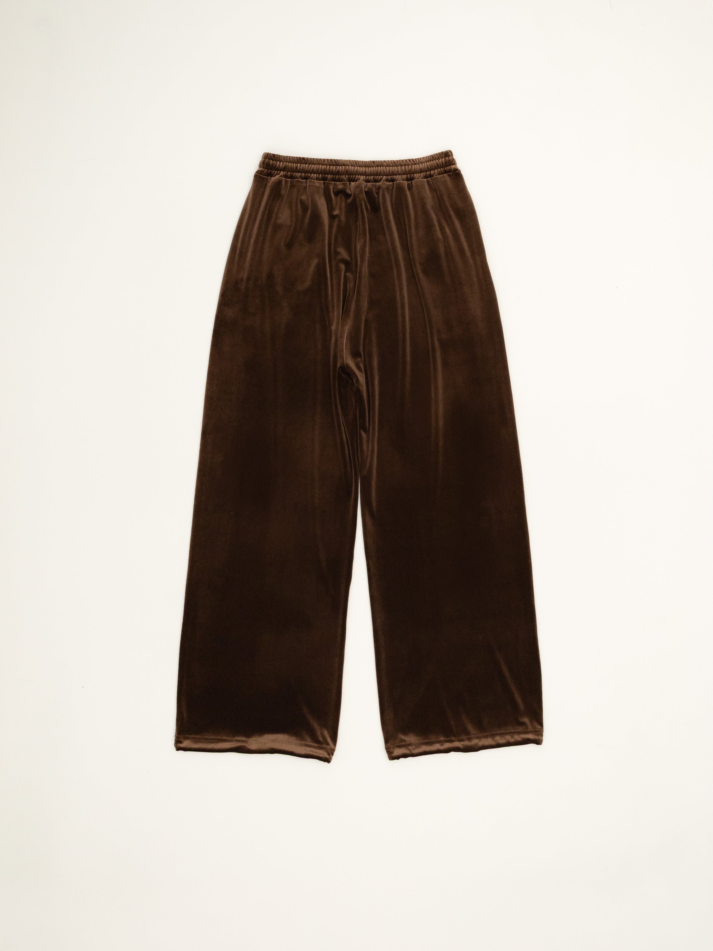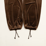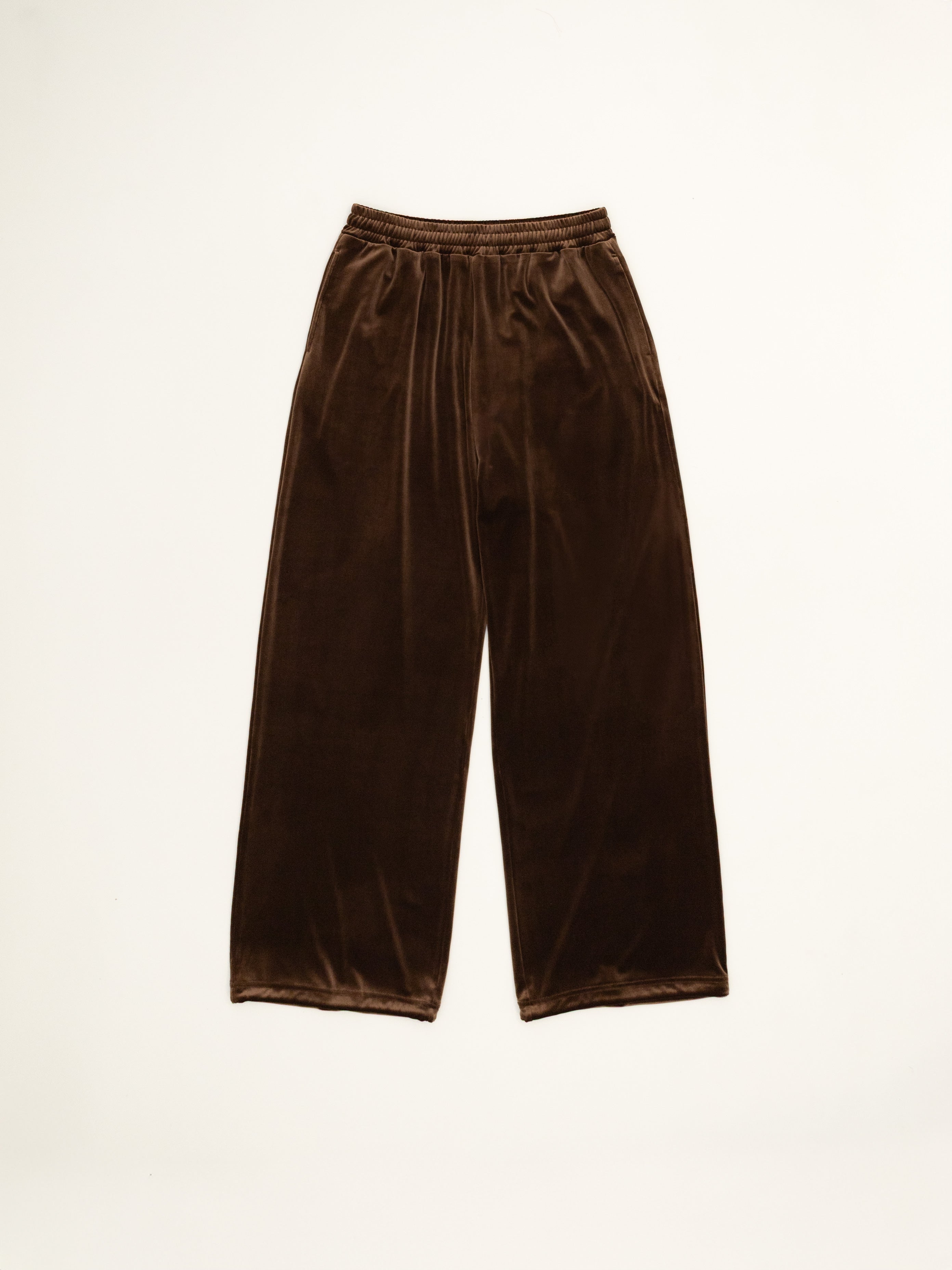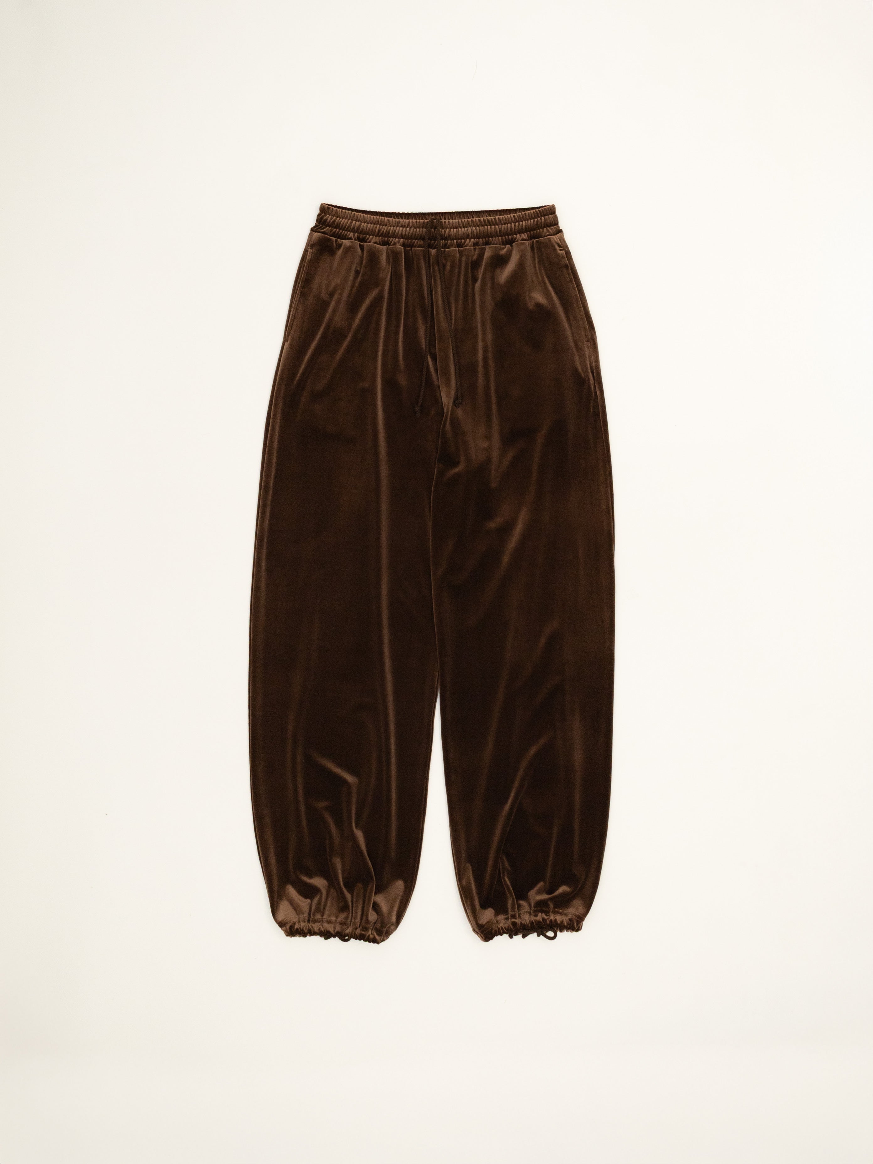 ウエストゴム、ドローコード入りのイージー仕様のベロアパンツ。