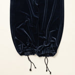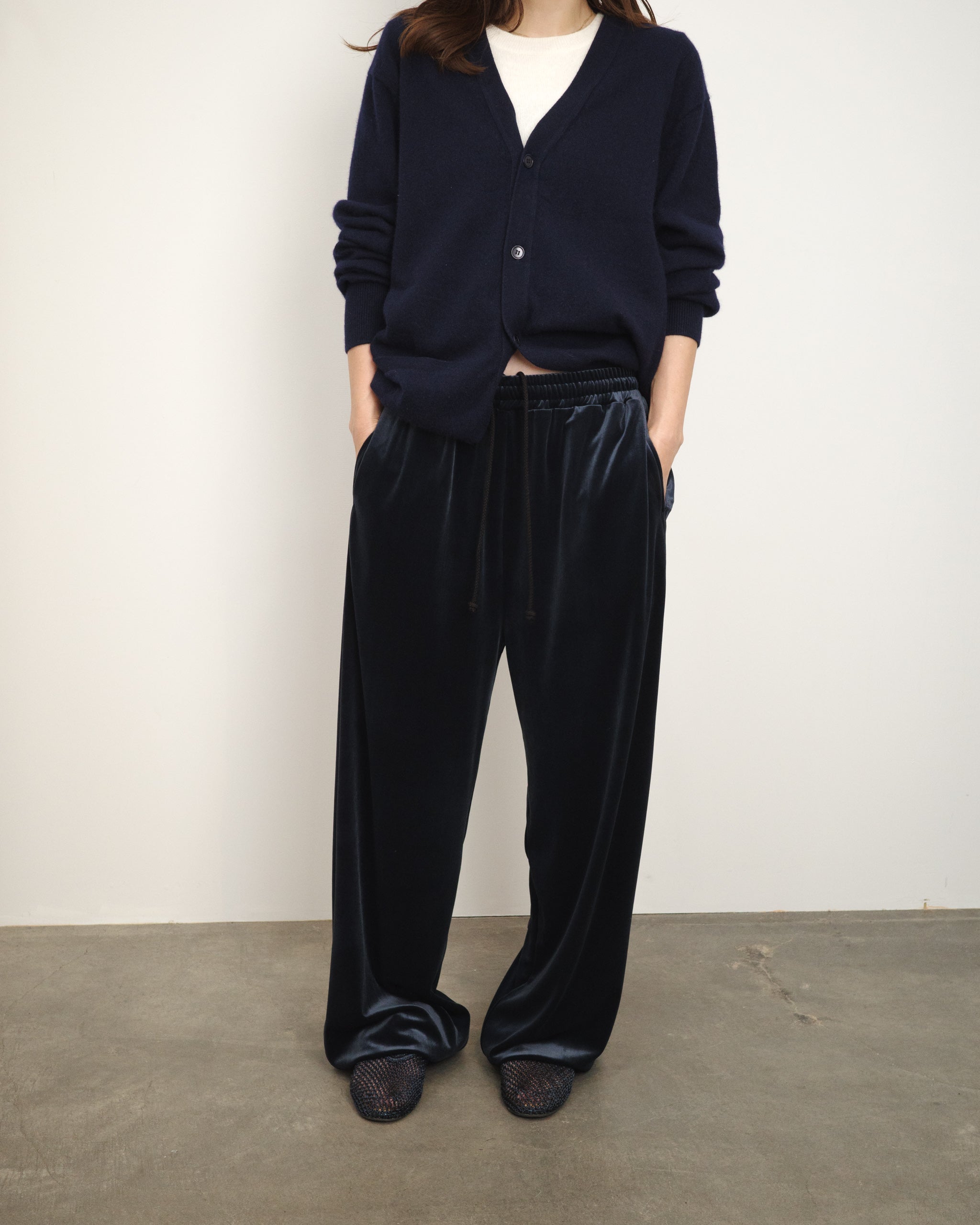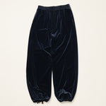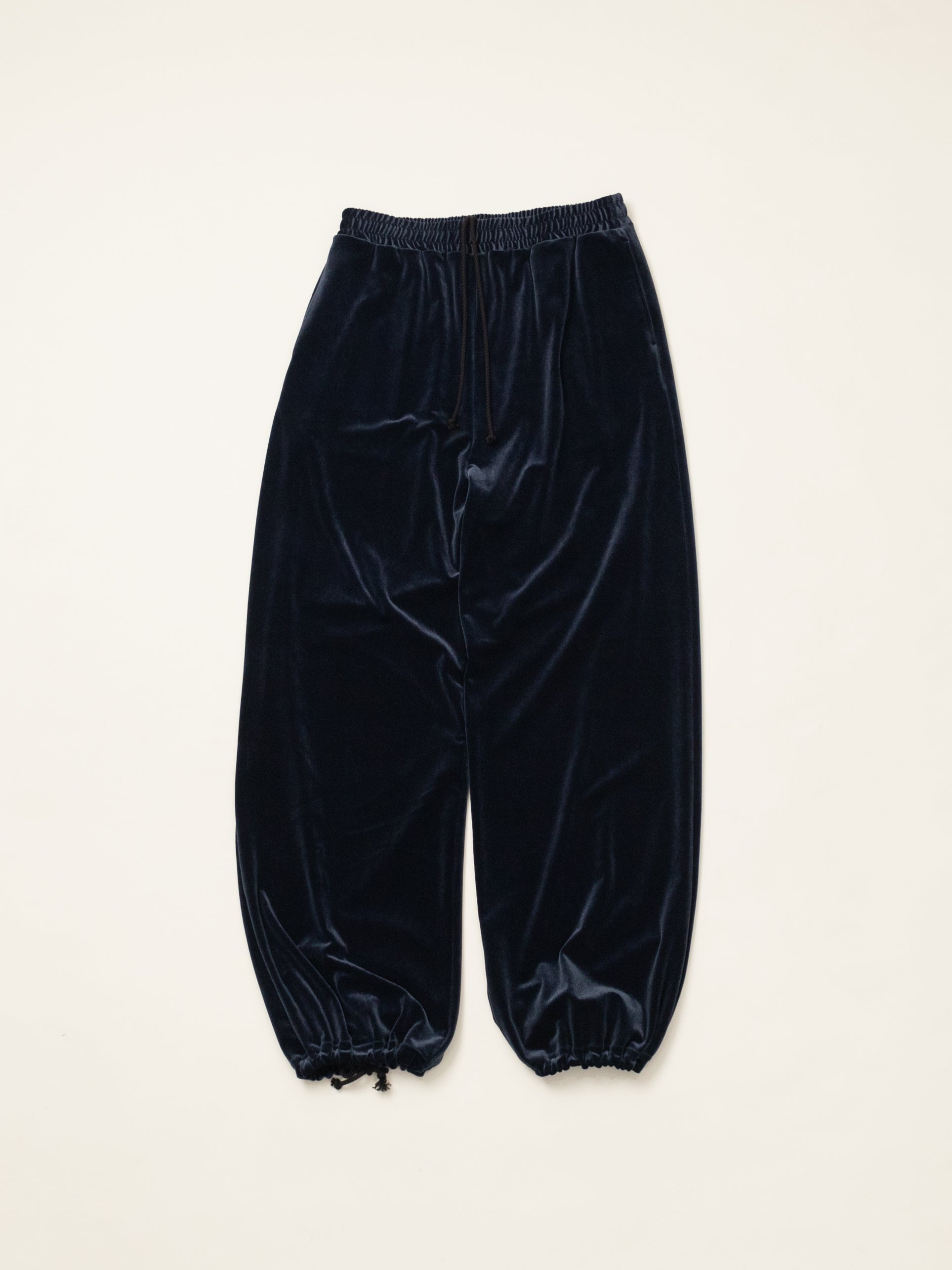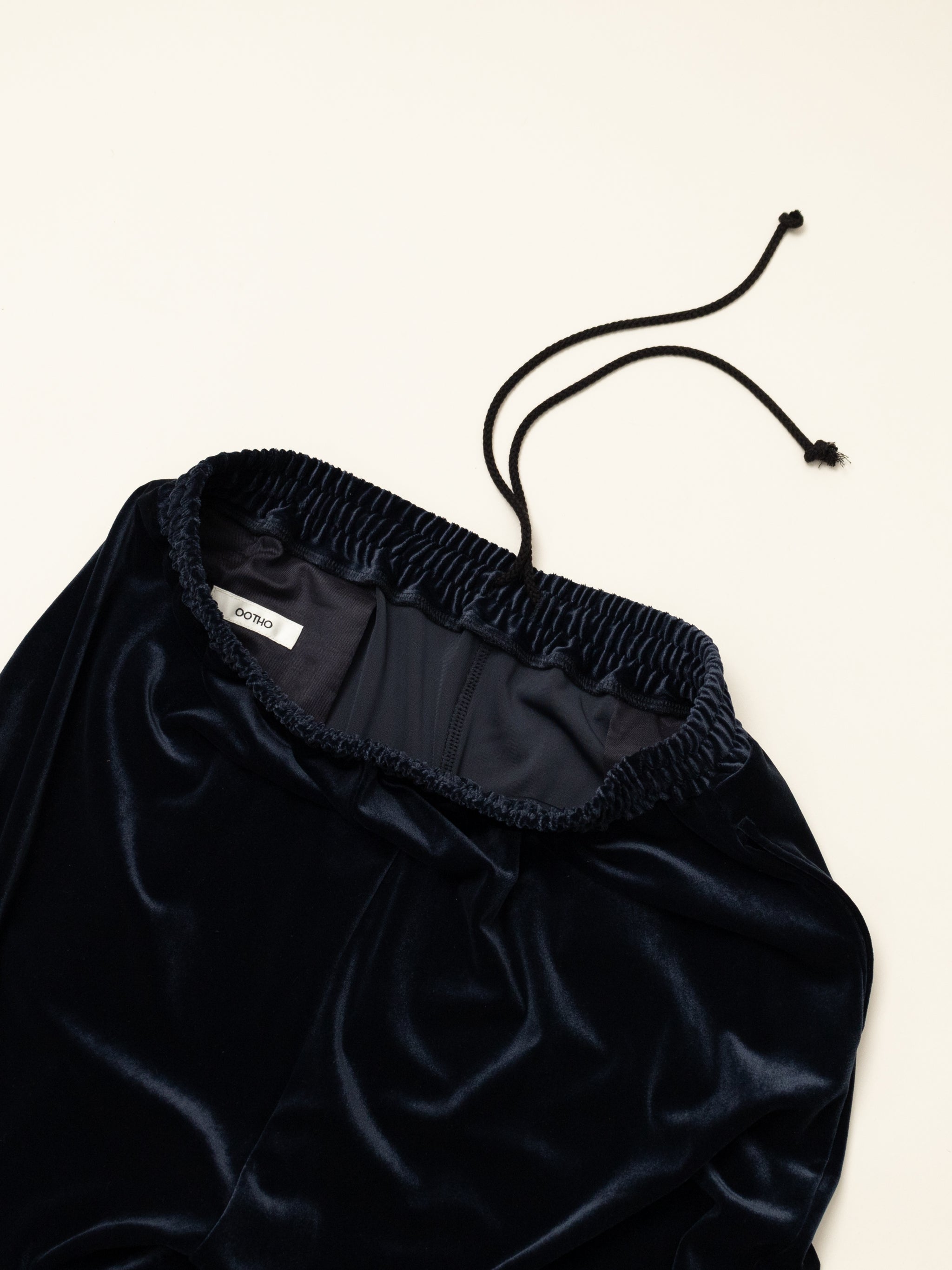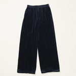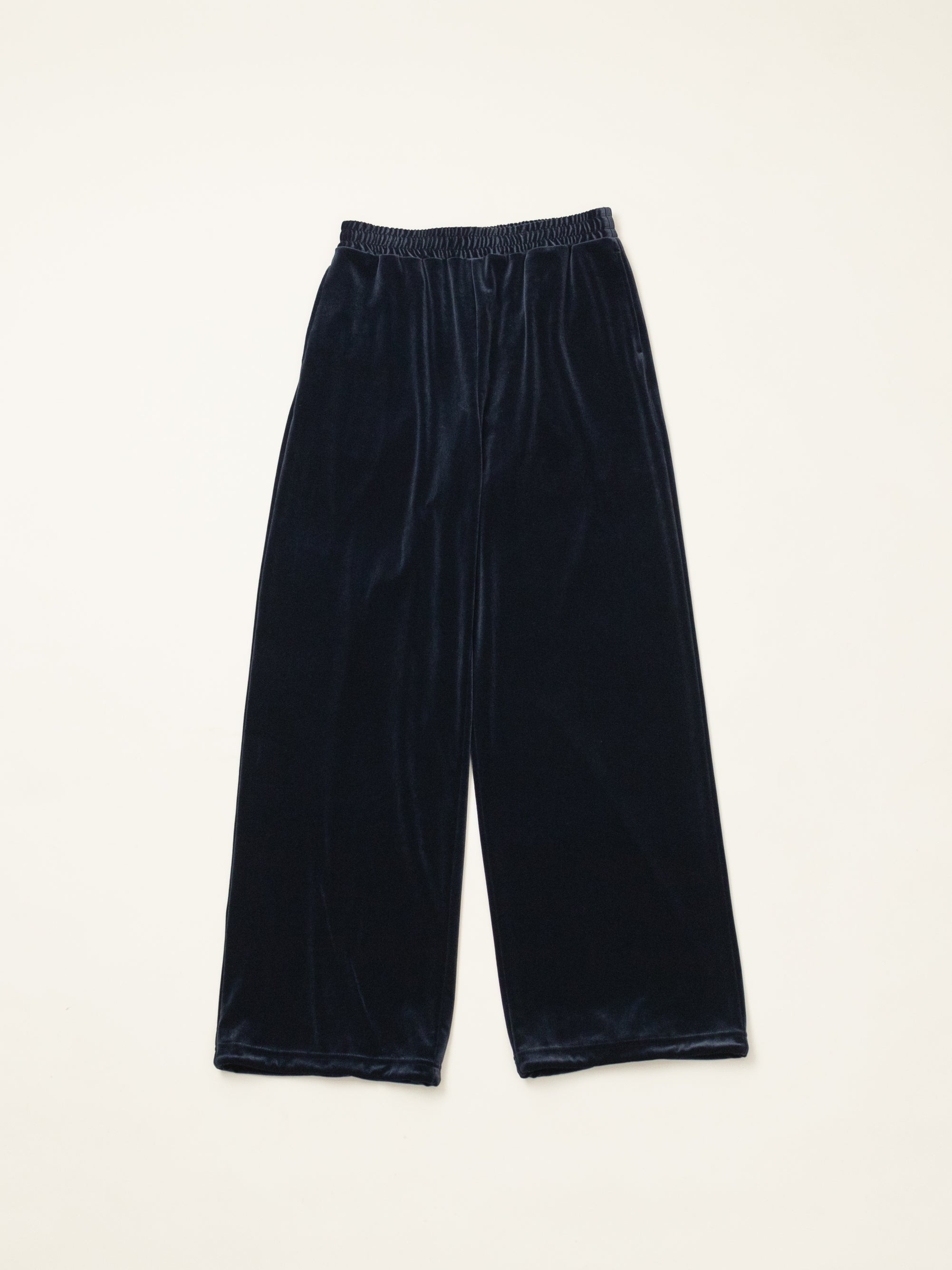 ウエストゴム、ドローコード入りのイージー仕様のベロアパンツ。