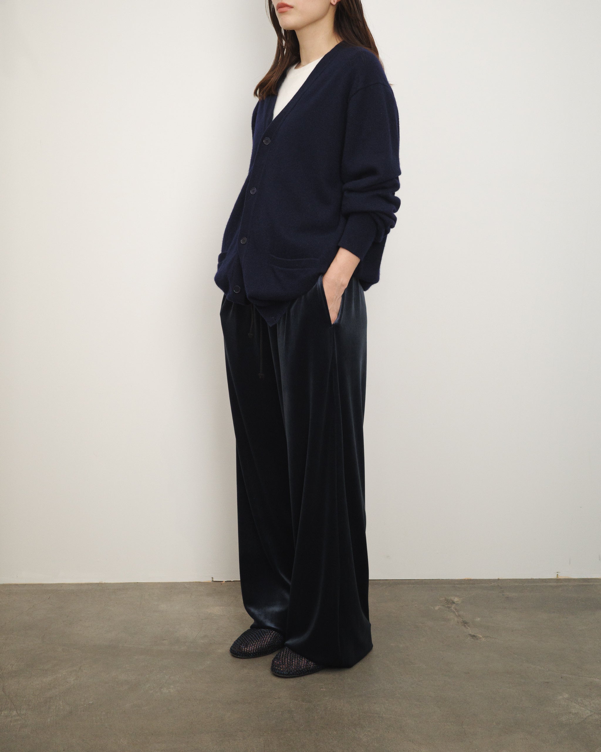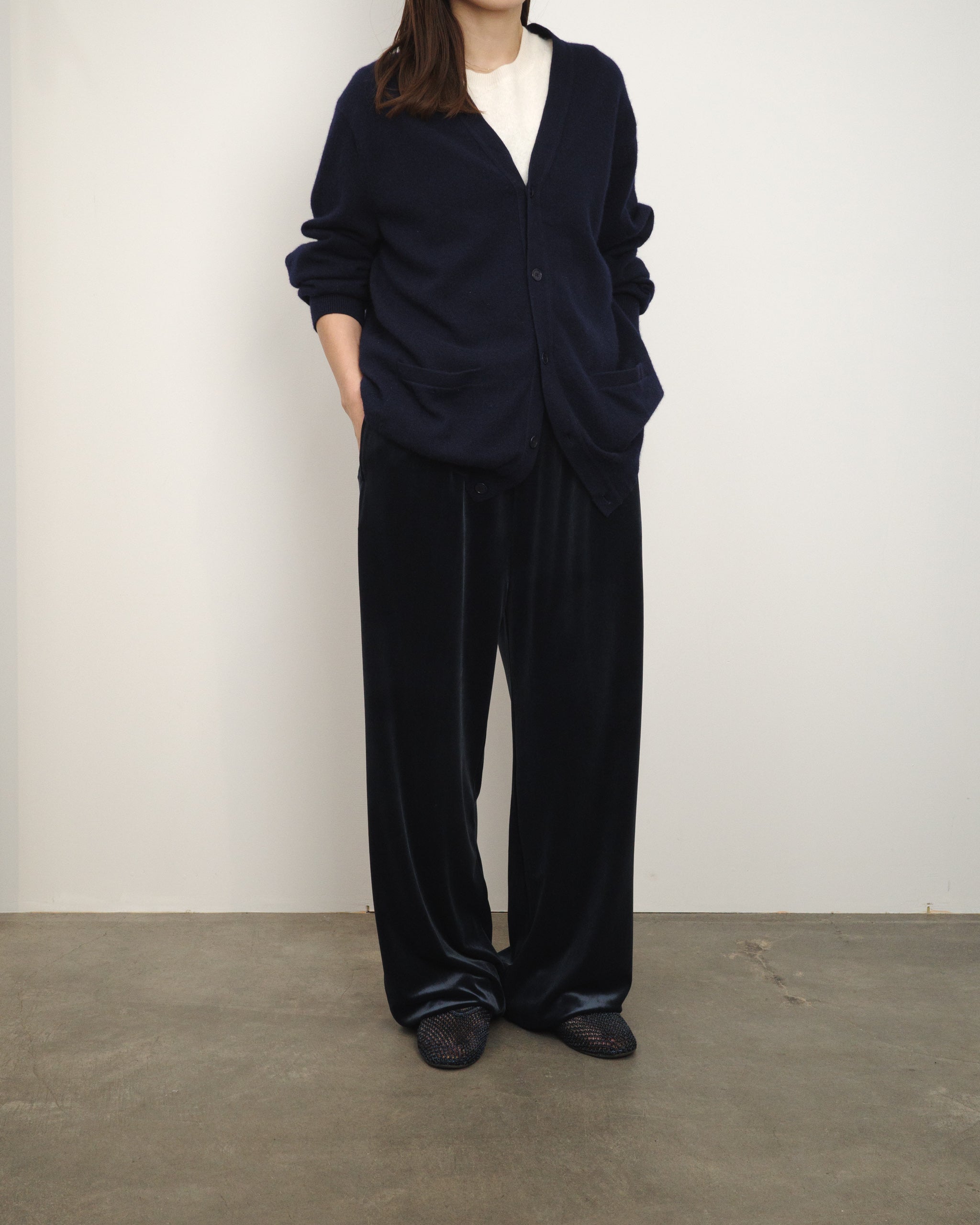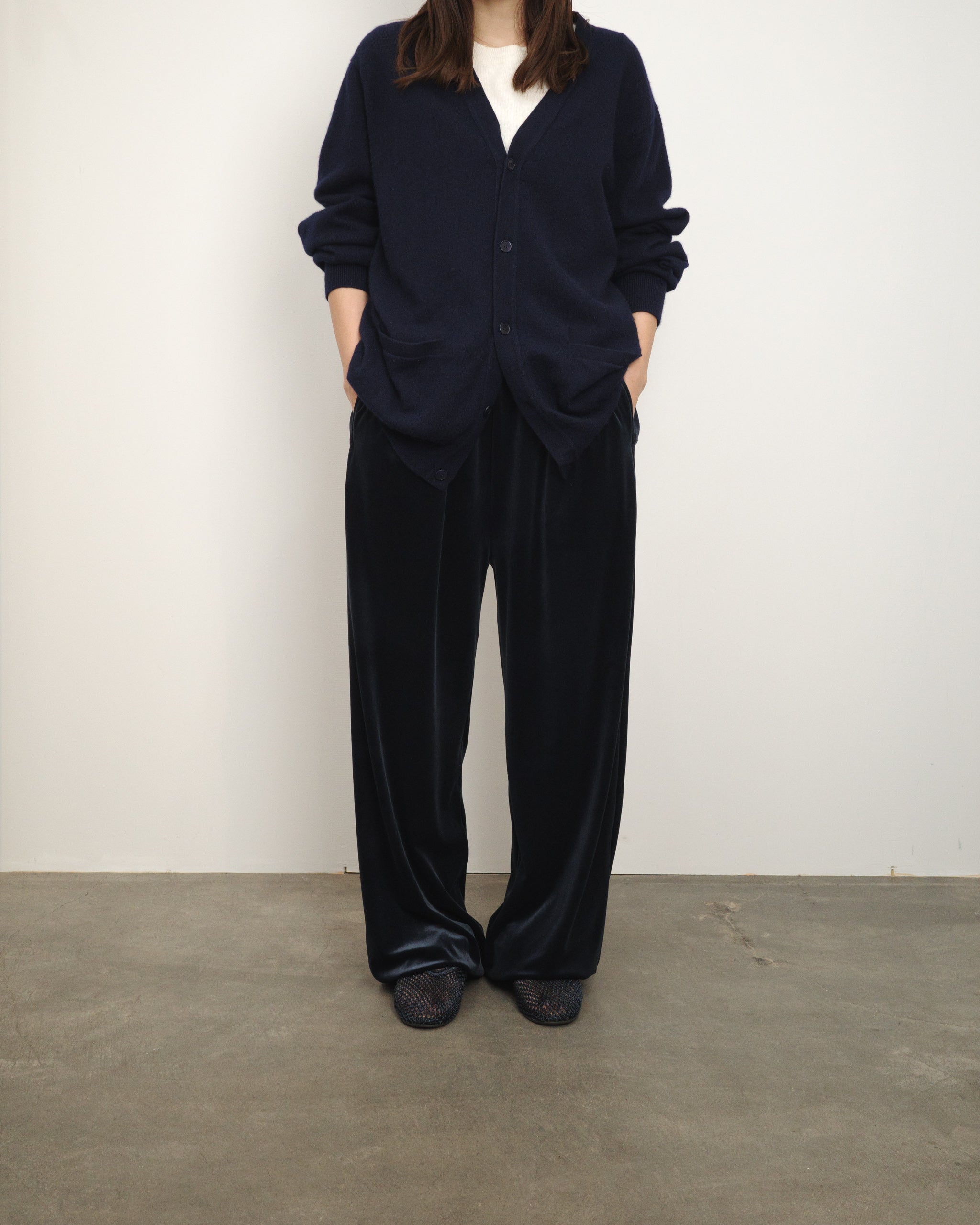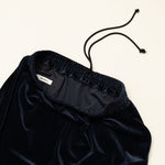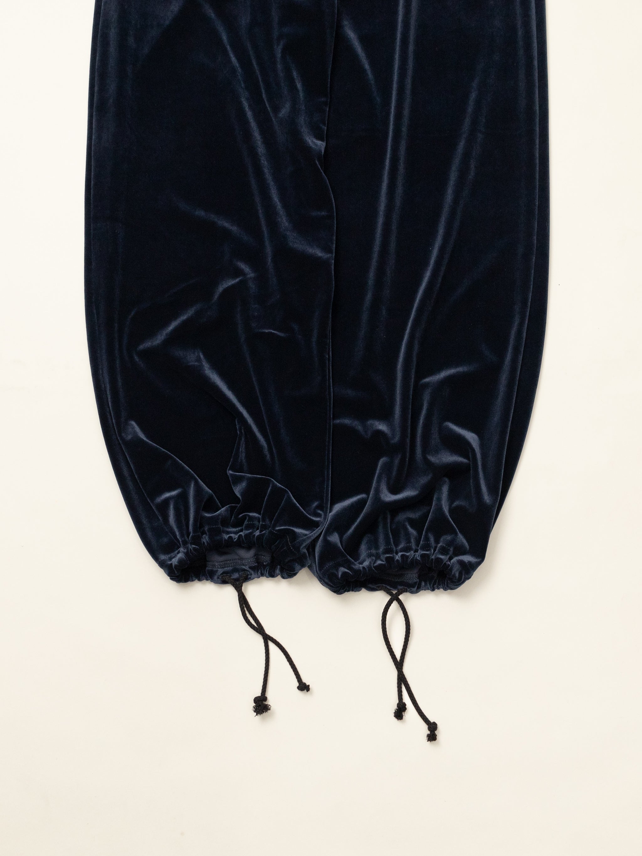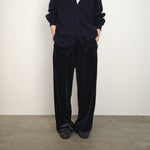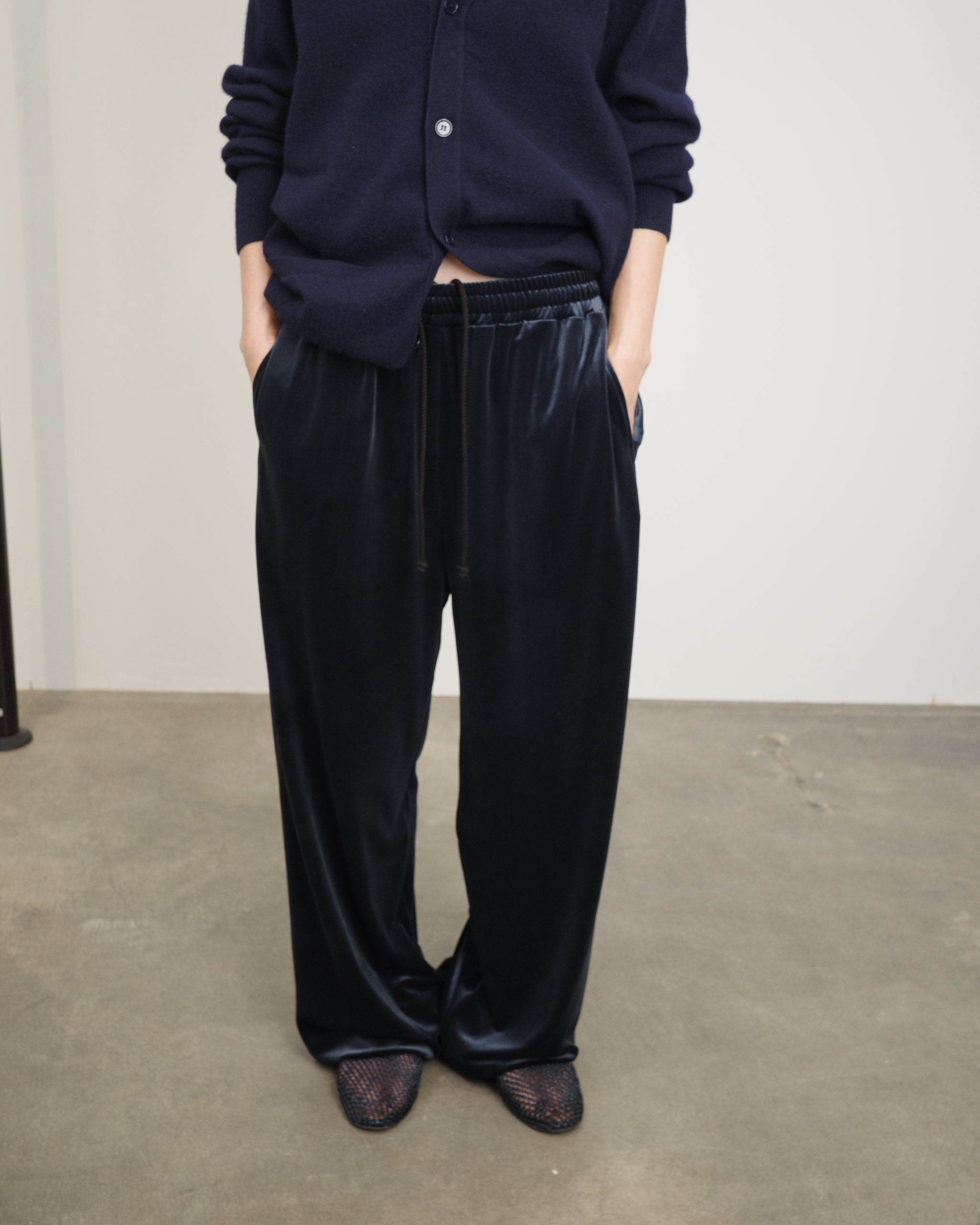 ウエストゴム、ドローコード入りのイージー仕様のベロアパンツ。