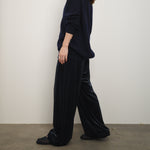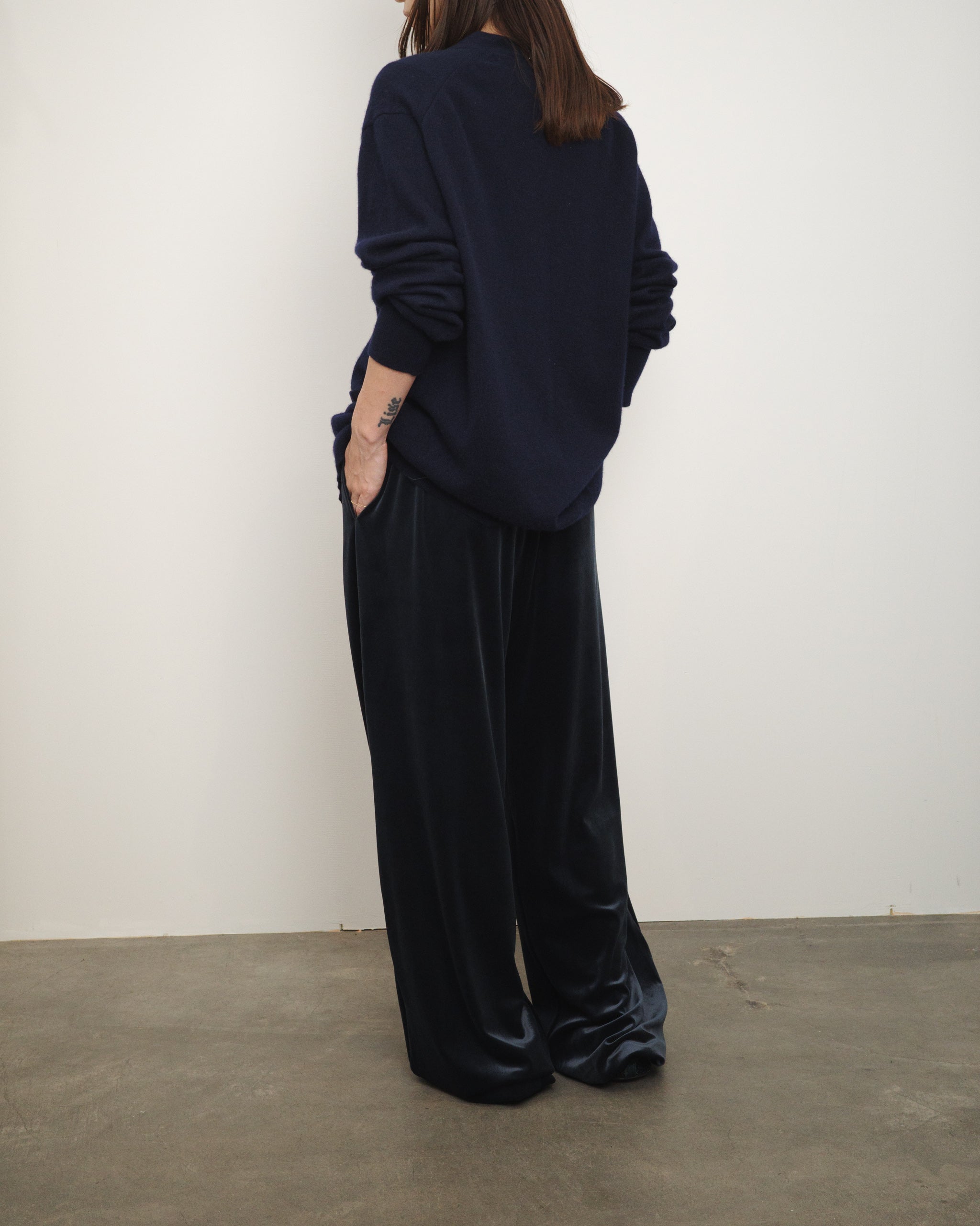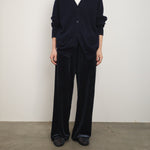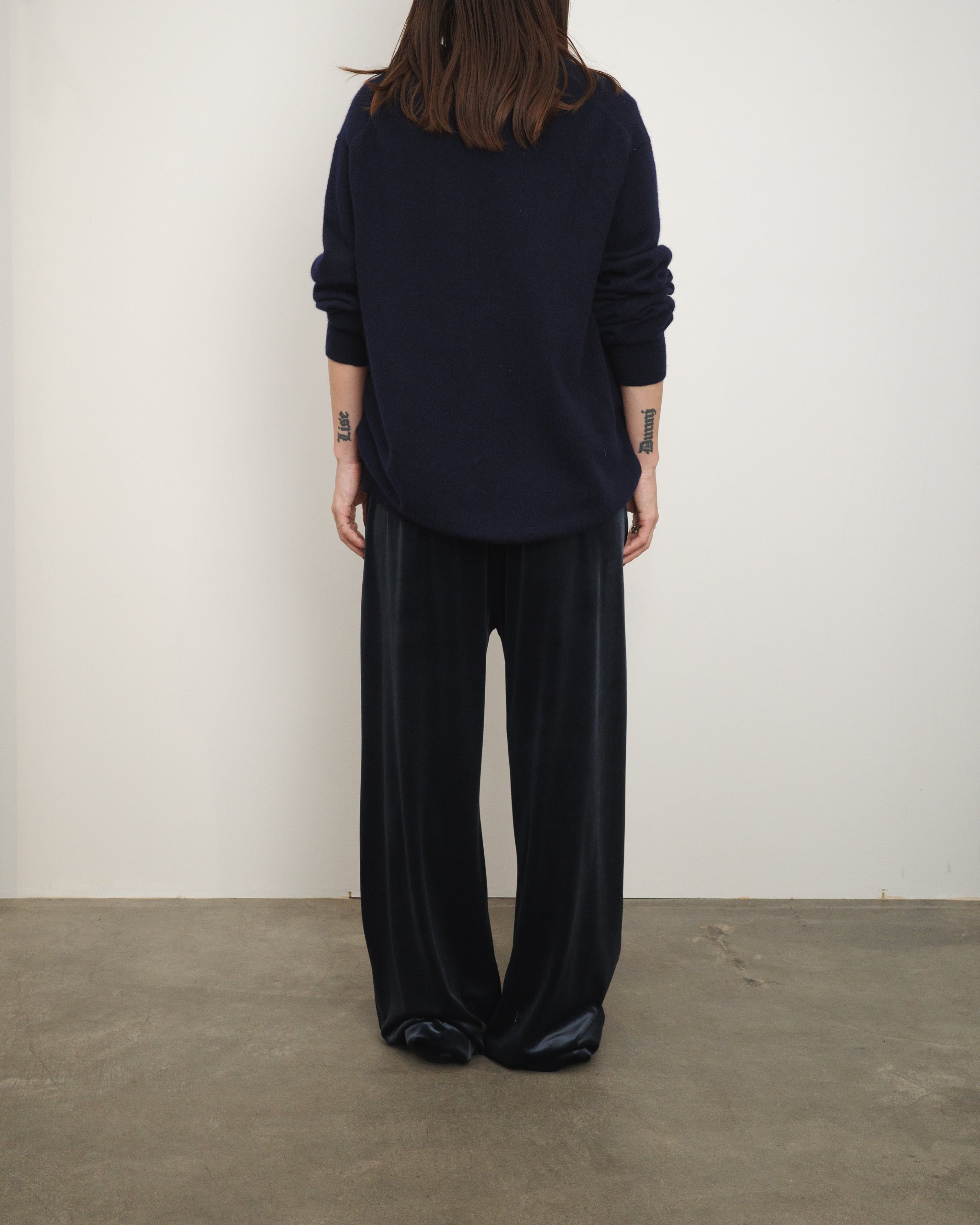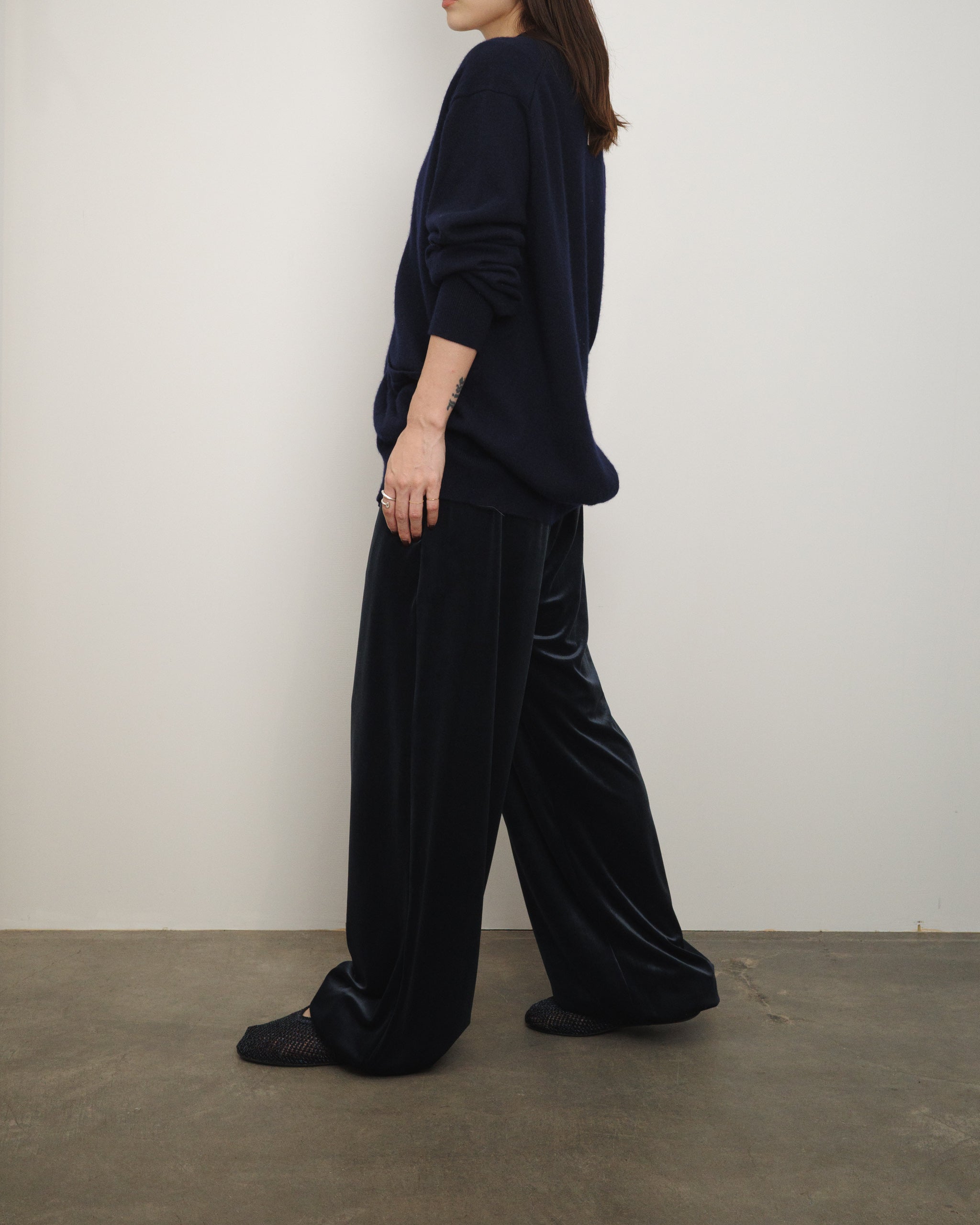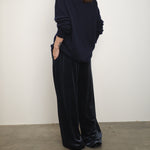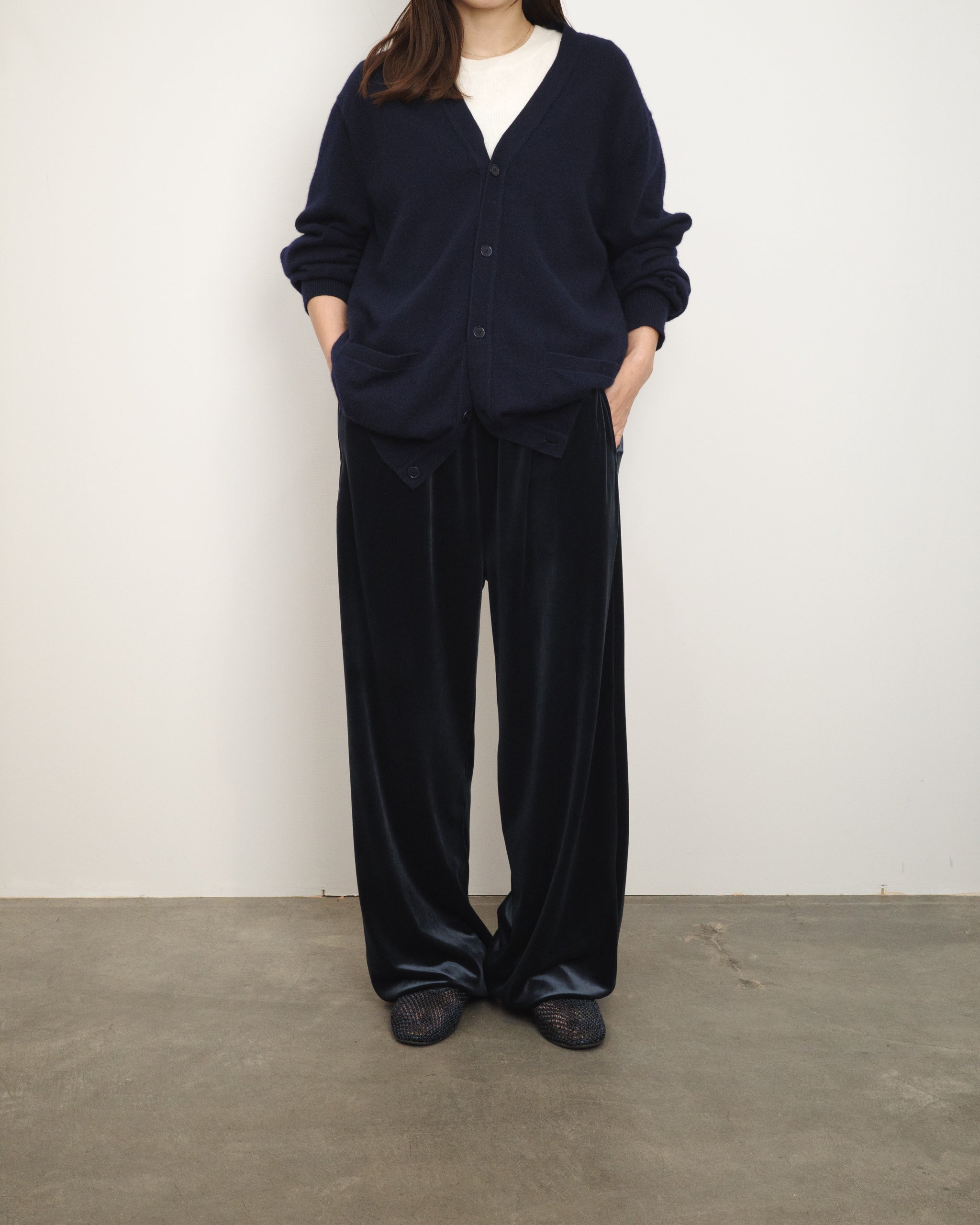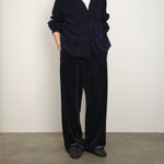 ウエストゴム、ドローコード入りのイージー仕様のベロアパンツ。