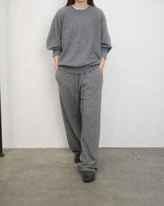 同素材のニットパンツとのセットアップでは統一感のある佇まいに。